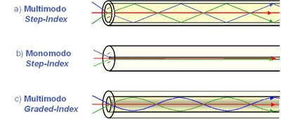 Vários comprimentos de onda a percorrer a mesma fibra ótica,tecnologia mais barata (que monomodo), Maior diâmetro e percorre distâncias mais curtas que as FO Monomodo. Apresenta maior dispersão modal.
